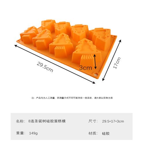 8連聖誕樹蛋糕模采用食品級矽膠製成,無毒無味,耐高溫,符合美國FDA標準,環保無公害,使用壽命長,質(zhì)地柔軟,抗撕裂,手感好,不怕摔不怕壓(yā),攜帶方(fāng)便,適用於(yú)微波爐、烤箱、冰箱、冰櫃、洗碗機